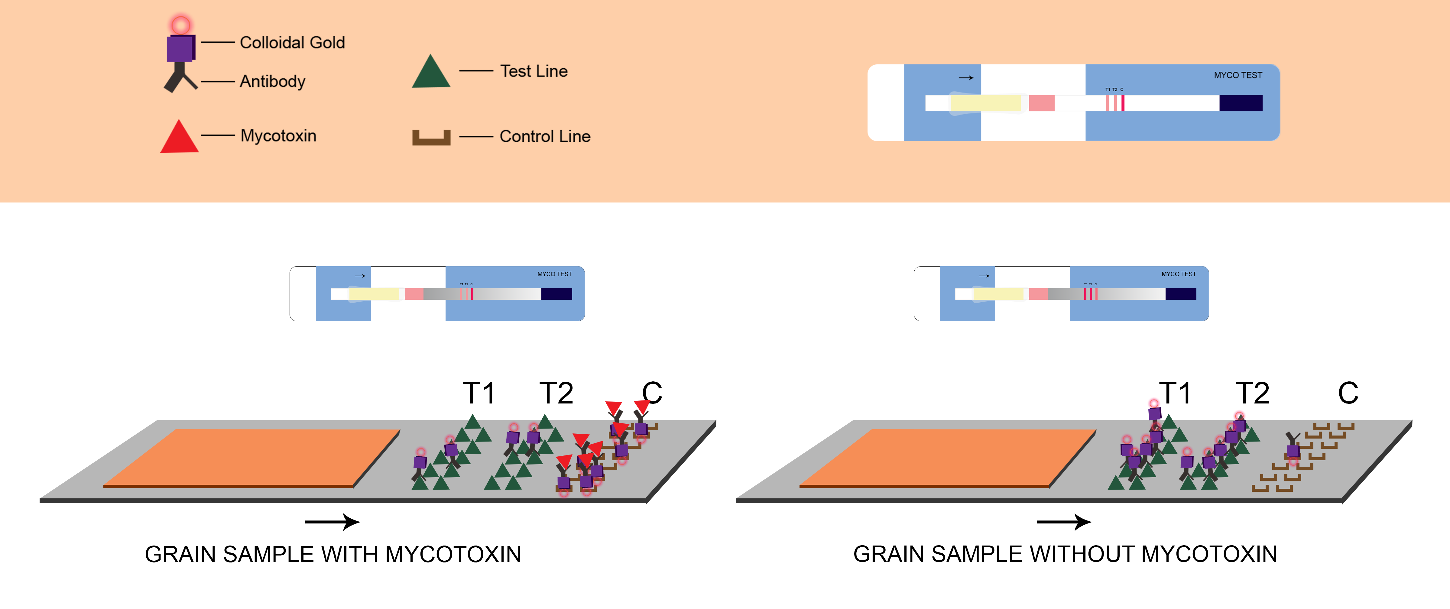 Mycotoxin is extracted from a sample using 70% methanol, ethanol, acetonitrile, distilled or deionized water. Mycotoxin interacts with colored beads in the lateral flow test strip and the color intensity in the test and control zones is measured by the ROSA-M Reader or Charm EZ®-M system and displayed as ppb (parts per billion) mycotoxin.