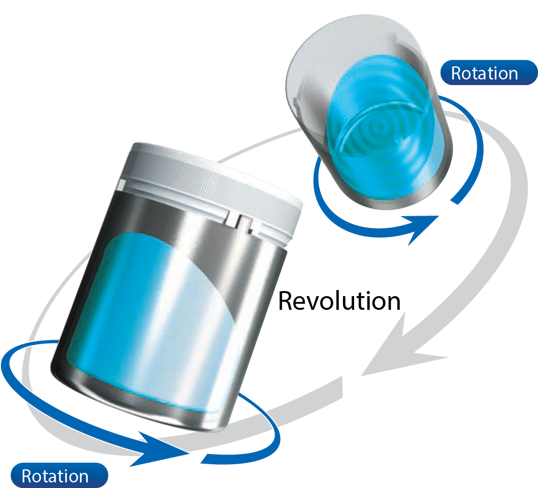 With centrifugal force by revolution move, material was grinding sidewall of container, then it can create mixing function with shearing force between container sidewall and material by rotation move.